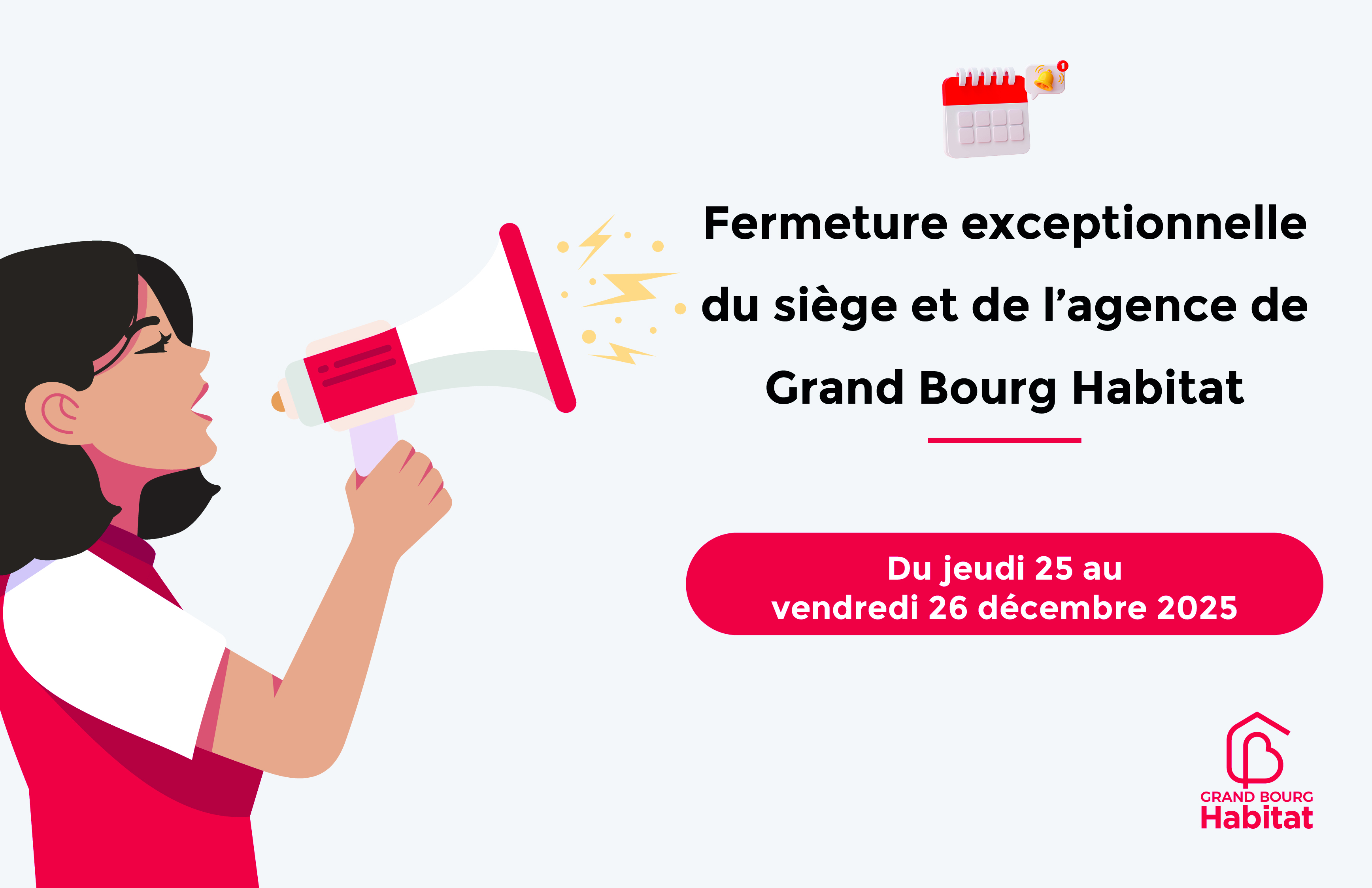 Grand Bourg Habitat vous informe ! Le siège et l’agence de Grand Bourg Habitat seront fermés du jeudi 25 au vendredi 26 décembre 2025. Retrouvez-nous dès le lundi 29 décembre 2025 ! 😊